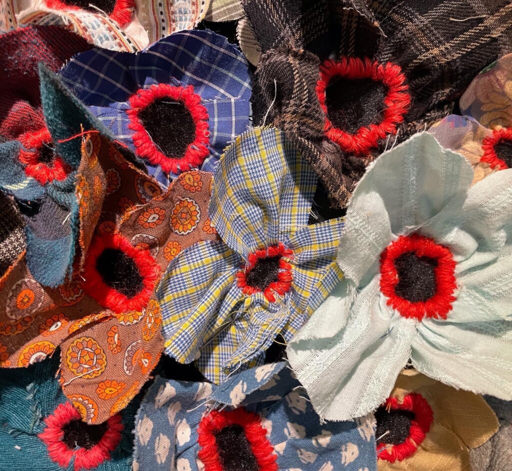 Two artists who work with similar shapes and colors, one in fabric and one in paint, with very different sensibilities. Jodi’s wall of fabric poppies, last seen at the Fuller Museum, is a hand-stitched memorial to the many recent opioid deaths. Philosophy Phd Ingrid expresses joy with abstract flower imagery in paint on canvas, reminiscent of mid-century modern. Their styles and messages are completely different but their palette and shapes are kin.