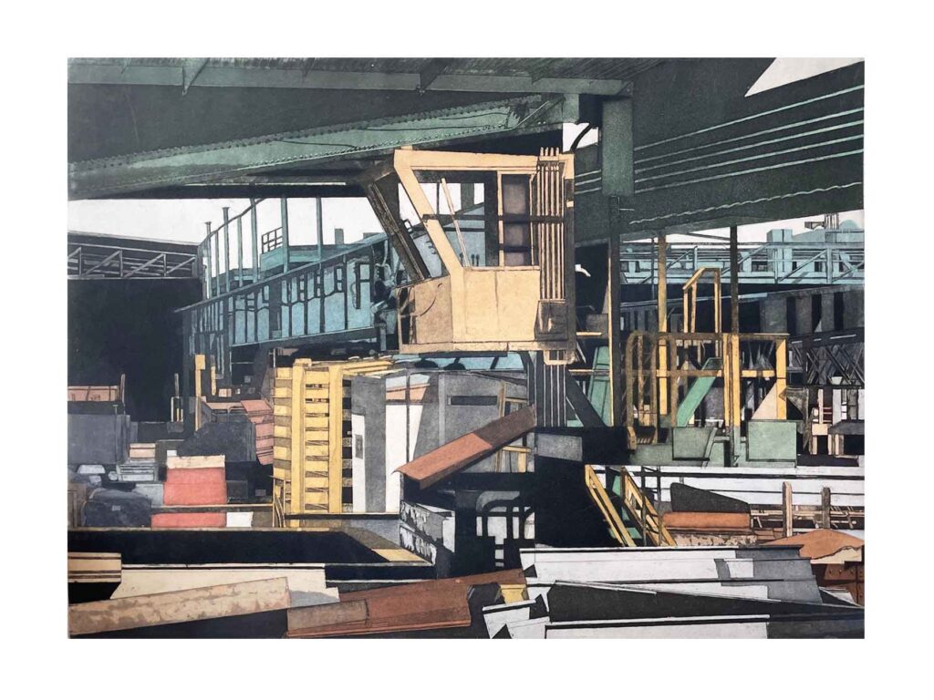 In a recent online interview (https://patlc.wordpress.com/interview-with-sidney-hurwitz/) Sidney said, “My interest in industrial and urban architectural imagery probably began while growing up in Worcester surrounded by industry. At 19 I did some woodcuts of three-deckers and railroad yards near my house as well as paintings of commercial buildings. After a number of years working with figural imagery I returned to industrial and urban images when living in London in 1973 where I became interested in structures from the Victorian era. I have continued that interest since. It became apparent to me that the structures and forms I found interesting were in many cases older and soon to be obsolete. I think earlier industrial forms such as bridges and steel mills were more formally complex from a design point of view compared to modern structures. I inadvertently, in many cases, documented a bygone industrial era without consciously being aware of it. I work in the medium of etching, some with aquatint and additional hand coloring”
